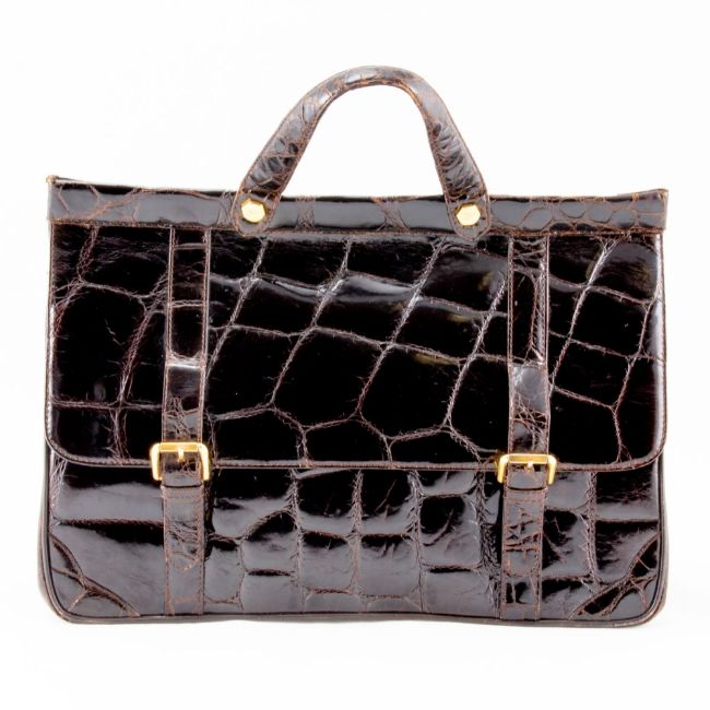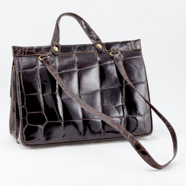 Fa. Franco Parmeggiani, Modena Italien. Art. 727. Braunes Krokodilleder, goldfarbene Beschläge. H. 27cm. H. kleiner Henkel 37 cm. H. großer Henkel: 70 cm. B. 38 cm. T. 17,5 cm. Firmenschild innen: Franco Parmeggiani Vero Cocodrillo Made in Italy, Modena. Gepflegter Zustand. Leichte Tragespuren. Seltenes Vintage Bag aus Krokodilleder in Braun. Magnetverschluss. Innen besteht die Tasche aus braunem Leder, ein Reißverschlussfach und 2 Steckfächer. Sehr gepflegter Zustand. Das Ehepaar Franco und Wilma Parmeggiani übernahm in den 1970er Jahren eine kleine Produktionsfirma in Modena. Erfahrungen im Herstellungsprozess, die Auswahl der wertvollsten Lederarten gepaart mit dem Gespür für Eleganz, zeichnet das Unternehmen aus. Die kleine Werkstatt wurde schnell zu einer Handwerksfirma, die Luxusgüter herstellte. Alligatoren, Krokodile, Pythons und Strauße wurden zu Handtaschen, Brieftaschen, Gürteln und Reiseartikeln für Mann und Frau. Das "Made in Italy" ist ein besonderes Element der Marke Parmeggiani. Jede einzelne Stufe der Verarbeitung, von der Auswahl der Häute bis zur endgültigen Verpackung, wird im Unternehmen von erfahrenen Handwerkern sorgfältig verfolgt und alles ist "handgemacht". Einzigartige Kreationen, limitierte Sammlungen.