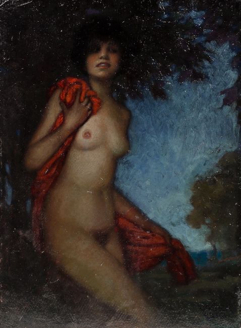 Künstler des frühen 20. Jahrhunderts - "Weiblicher Akt" - Öl/Karton. 48,5 x 36 cm. Sign. und dat. r. u.: VASEK / 1917. Rückseitig auf Etikett bez. und betit.: G. Vasek (...) / "Weiblicher Akt" / Preis 900M. Rahmen. Krakelee l. o.