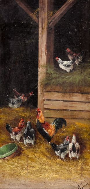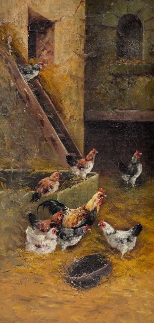 Künstler des 19./20. Jahrhunderts - Hühner im Heu - Öl/Lwd. 63 x 31,3 cm. Sign. r. u.: A. Prehn. Rahmen. Leichte Delle. - Hühner im Stall - Öl/Lwd. 63 x 31 cm. Sign. r. u.: A. Prehn. Rahmen. Farbverluste.