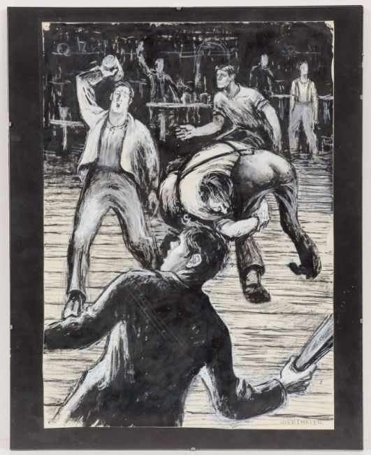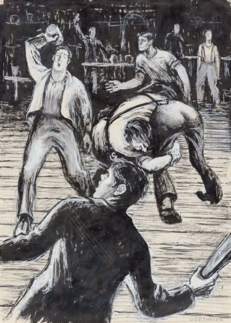 1910 München - 1942 gef. in Russland - Kneipenschlägerei - Tusche und Gouache/Papier. 46 x 33 cm. Sign. r. u.: VIERTHALER. Verso an Unterlegkarton montiert. Voll ansichtig unter Glas gerahmt. Kleiner Einriss und leichter Knick am rechten Rand.