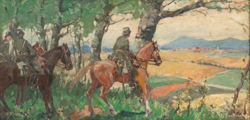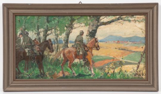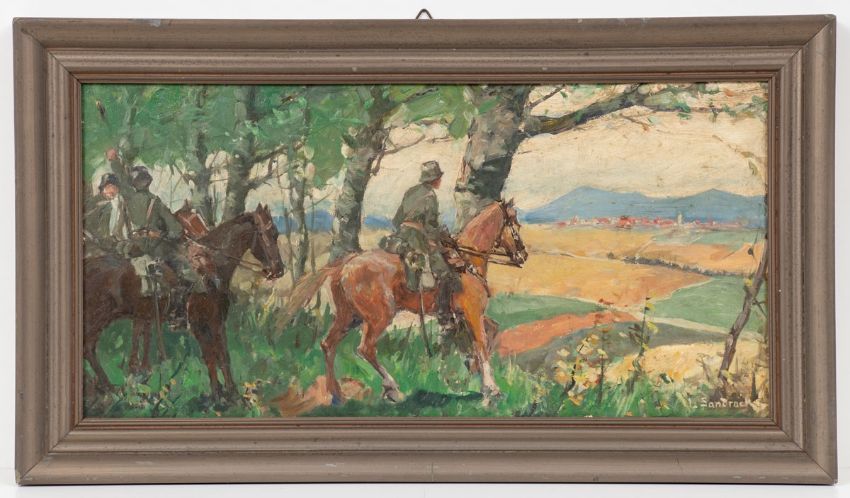 1867 Neumarkt (Schlesien, heute Polen) - 1945 Berlin - Soldaten beim Beobachten einer Stadt - Öl/Hartfaser. 26 x 53 cm (Sichtmaß). Sign. r. u.: L. Sandrock. Rahmen. - Lit.: Vollmer 4, S. 155. Leonhard Sandrock siedelte mit 27 Jahren nach Berlin und wurde Schüler bei dem Landschafts- und Marinemaler H. Eschke. 1898 Mitglied des Vereins Berliner Künstler (VBK). Er beteiligte sich regelmäßig an den Berliner Kunstausstellungen. Auf seinen Reisen u.a. nach Hamburg ließ er sich vom Hafen und den Dampfschiffen inspirieren.