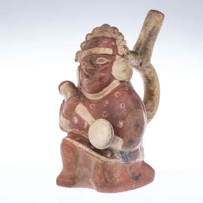 Peru, Moche-Kultur, 300 v. Chr. - 700 n. Chr. Gebrannter Ton, roter Scherben. Weißliche Bemalung. H. 21 cm, B. 14,5 cm, T. 20 cm. Mündung des Ausgusses mit sehr geringer, wohl älterer Abplatzung; im Innern des Gefäßes ein loses Kleinteil. Die Rechnung über 3.500 DM von 1987 (Kunsthandel Faehte, Berlin) liegt in Kopie vor. Ausdrucksstarker, knieender Krieger mit Bandhenkelausguss am Rücken. Die weißliche Bemalung sowohl vorder- als auch rückseitig.
