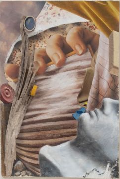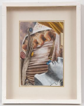 1943 Greifswald - lebt in Hannover - "Holzflügelfantasie" - Assemblage/Karton auf MDF-Platte. 44 x 29 cm. Sign. und dat. l. o.: J. Claus (19)87. Rückseitig auf Künstleretikett bez., betit. und dat. Im Objektrahmen unter Glas gerahmt. Ungeöffnet.