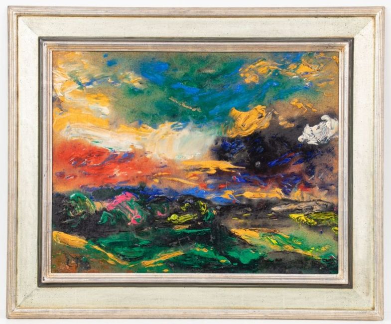 1913 Königsberg - 1988 Wulfsdorf bei Lübeck - Expressive Landschaft - Öl/Spanholz. 50 x 64,5 cm. Monogr. l. u.: LM. Verso bez., sign., ortsbez. u. dat.: "Umseitiges Bild ist von mir gemalt. Original-Signierung links unten im Bild. Datum 64. L. Malskat / Bredegatt / 1964. Hier beschriftet Okt. 1978 / Lübeck-Wulfsdorf." Verso weiterhin bez.: "Damals - 1964 - konnte ich mir kein Päckchen Tabak zum Zigarettendrehen leisten. Ich war dort überall als Pumpheinrich bekannt. LM". Rahmen. Kleine Farbabplatzer, kleine Kratzer.