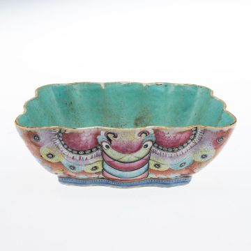 China, wohl Ende 19. Jahrhundert. Porzellan, glasiert, polychrom bemalt. H. 7 cm. Rote Aufglasur-Bodenmarke. Leicht best. Trapezförmige Schale mit gewelltem Rand. Innen und auf dem Boden türkis glasiert, die Wandung mit polychromem Dekor.