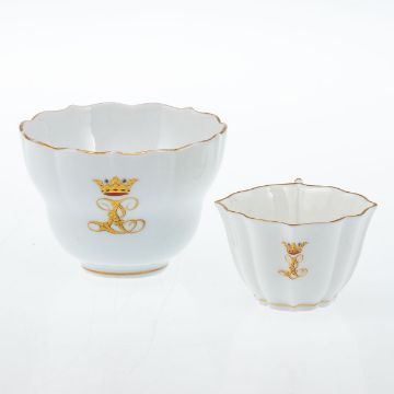 Königliche und Staatliche Porzellan Manufaktur, Meissen 1850-1924. - Monogramm LR unter Adelskrone - Porzellan, weiß, glasiert. Polychrom und Gold bemalt. Goldrand. Unter der Glasur blaue Schwertermarke. 1. Wahl. H. der Kot.: 6,5 cm, H. der p. Ot.: 4,5 cm. - Zustand: Kot. Goldrand ber. und unterer Henkelansatz mit Sprung - p. Ot. unterer Henkel best. - bei beiden vereinzelte Flugaschepunkte.
