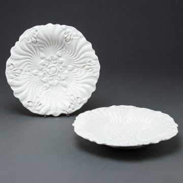Königliche Porzellan Manufaktur (KPM), Berlin 1849-1870. - Fuchsien und Blätter - Weißporzellan, glasiert. Unter der Glasur blaue Zeptermarke und Pfennigmarke. 1. Wahl. H. 4 cm, D. 29 cm. - Zustand: beide S. mit Flugaschepunkten und Glasur an einigen Stellen ber. - 1 S. mit uns. rest. Ausbruch am Rand.