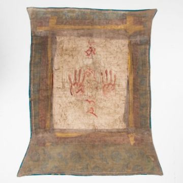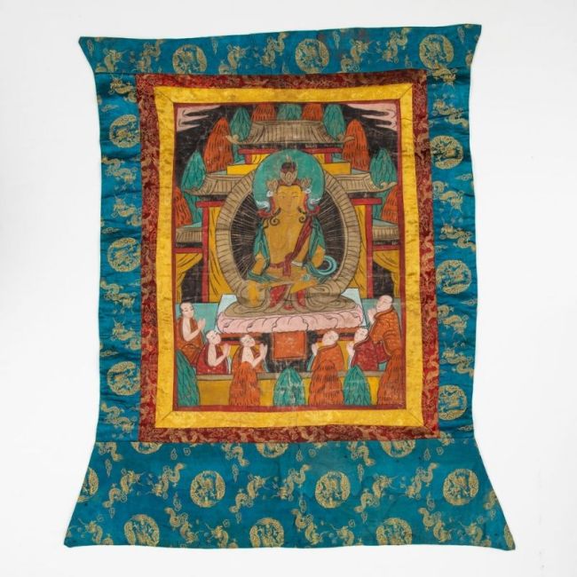 Tibet, wohl 19. Jahrhundert. - Gelbe Tara - Gouache/Leinen, Seidenbrokat. 59 x 45 cm, 96 x 84 cm (Montierung). Verso Handabdrücke u. Bez. in rot. Gebrauchsspuren, Thangka teils leicht knickspurig, Seidenmontierung teils etw. angeschmutzt.