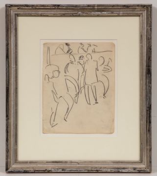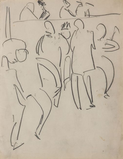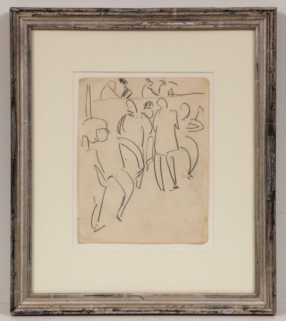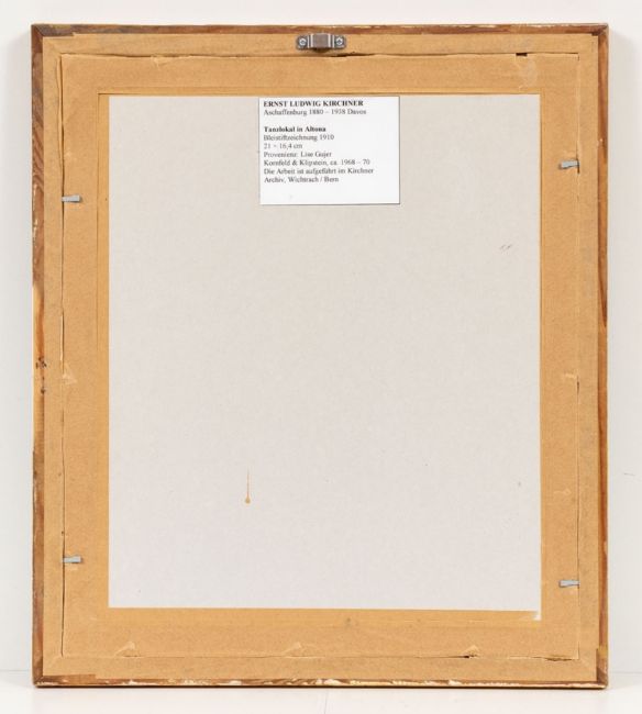 1880 Aschaffenburg - 1938 Frauenkirch-Wildboden - "Tanzlokal in Altona" - Bleistift/Papier (Skizzenbuchseite mit abgerundeten Ecken und Rotschnitt). 20,9 x 16,4 cm. Rückseitig bez.: B20 / Tanzlokal Altona / 1910 / vgl. Rad. Dube 99. Auf der Rückseite des Rahmens auf Etikett bez.: (...) Tanzlokal in Altona / Bleistiftzeichnung 1910 (...). Passepartout. Voll ansichtig unter Glas gerahmt. - Dieses Werk ist im Ernst Ludwig Kirchner Archiv Wichtrach/Bern dokumentiert. - Lit: Gerd Presler, Ernst Ludwig Kirchner, Die Skizzenbücher "Ekstase des ersten Sehens«, Monographie und Werkverzeichnis, Karlsruhe/Davos 1996, S. 208. - Provenienz: Lise Gujer, Davos-Sertig; Kornfeld & Klipstein, Bern (ca. 1968-1970); The Marlborough Fine Art, London (2003). Das Blatt lässt sich dem Skizzenbuch Presler Skb 14 zuordnen (Werkverzeichnis "Ekstase des Ersten Sehens") Die Skizze dürfte während eines Aufenthaltes Kirchners in Hamburg entstanden sein, bei dem er am 14. Oktober 1910 auch den Landgerichtsdirektor Dr. Gustav Schiefler und seine Frau Luise in der Oberstraße 86 in Hamburg-Harvestehude besuchte. Das Blatt trägt die für das Skizzenbuch typischen Merkmale: Rotschnitt und abgerundete Ecken. Wir danken Herrn Prof. Dr. Dr. Gerd Presler für seine wissenschaftlichen Auskünfte.