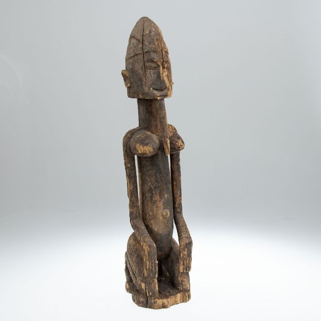 Dogon, Westafrika. Holz, geschnitzt. H. 56 cm. Altersspuren, best., rückseitig Rissbildung (alt). Provenienz: Norddeutsche Privatsammlung. Figur mit geometrischer Anlage. Der Torso säulenartig, kegelförmige Brüste, erhabener Bauchnabel. Schmaler, nach oben gelängter Kopf mit kammartiger Frisur. Unter dem Kinn ein Unterlippenpflock.