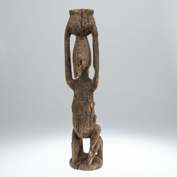 Dogon, Westafrika. Holz, geschnitzt. H. 56,5 cm. Witterungsspuren, Holz in unterer Gesichtspartie etw. nachgiebig. Provenienz: Norddeutsche Privatsammlung. Die knieende Figur trägt ein Gefäß auf dem Kopf. Dieses ist oben flach ausgeführt. Auf dem Rücken klammert sich, als Relief geschnitzt, ein Kind. Der Kopf ist hoch und schmal ausgeführt, mit einer kammartig über den Hinterkopf laufenden Frisur.