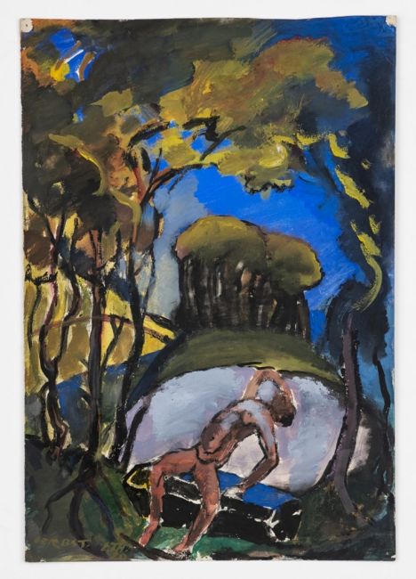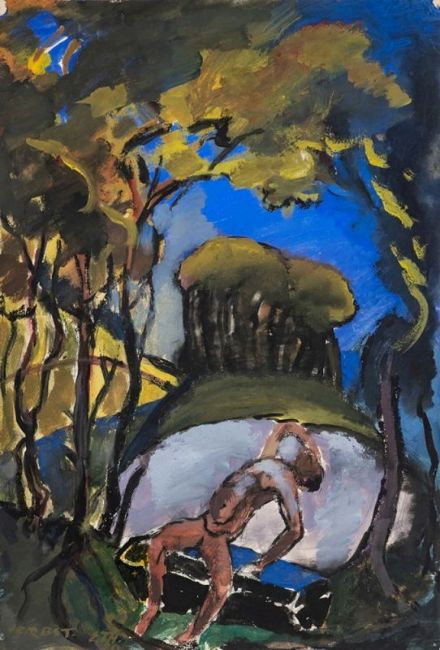 1896 Nienburg - 1983 Wietzen - "Herbst" - Gouache/festes Papier. 35,8 x 24,5 cm. Betit., monogr. und dat. l. u.: HERBST. / E. TH. / (19)20. Das Blatt liegt lose. Obere Ecken malbedingt mit Nadeleinstichlöchern. - Lit.: Allnoch, Michael (Hrsg.). Ernst Thoms. Werkverzeichnis 1920-1983. Nienburg/Weser 2013 (nicht verzeichnet). - Die Arbeit wurde unter der Werkverzeichnisnummer Th-00989 in den Nachtrag des Werkverzeichnisses aufgenommen. In dieser psychologisierenden Arbeit wird ein Seelenzustand veranschaulicht. Im Zentrum der Betrachtung steht der einzelne Mensch, sich über das eigene nahe Lebensende bewusst (bildhaft verdeutlicht durch den Sarg, auf den er sich stützt) und sein hiermit im Zusammenhang stehendes Gefühl der Ohnmacht (ausgedrückt durch die Haltung und die vor die Augen gelegte Hand). Eingebettet ist die Szenerie in eine herbstliche Parklandschaft, die das Geschehen subtil umfängt. Schüler von F. Burger-Mühlfeld und Hauptvertreter der Neuen Sachlichkeit Hannover. 1928 Ausstellung in der Galerie Neumann-Nierendorf. Beteiligung an den Deutschen Kunstausstellungen in Amsterdam und Stockholm.