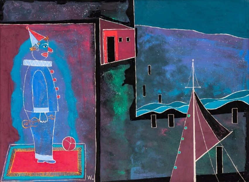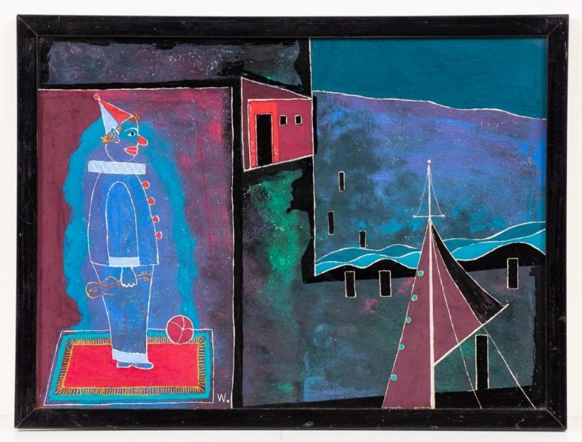 1899 Gnoien - 1980 Hannover - Der Clown und das Meer - Hinterglasmalerei. 26,2 x 35,7 cm (Sichtmaß). Monogr. l. u.: W. Rahmen. - Lit.: Teschemacher, A. F. Erich Wegner. Braunschweig 1983. Wegner besuchte die Grafik-Klasse von Burger-Mühlfeld an der Kunstgewerbeschule Hannover. Großer Vertreter der Neuen Sachlichkeit in Hannover.
