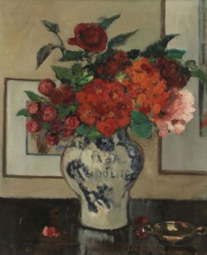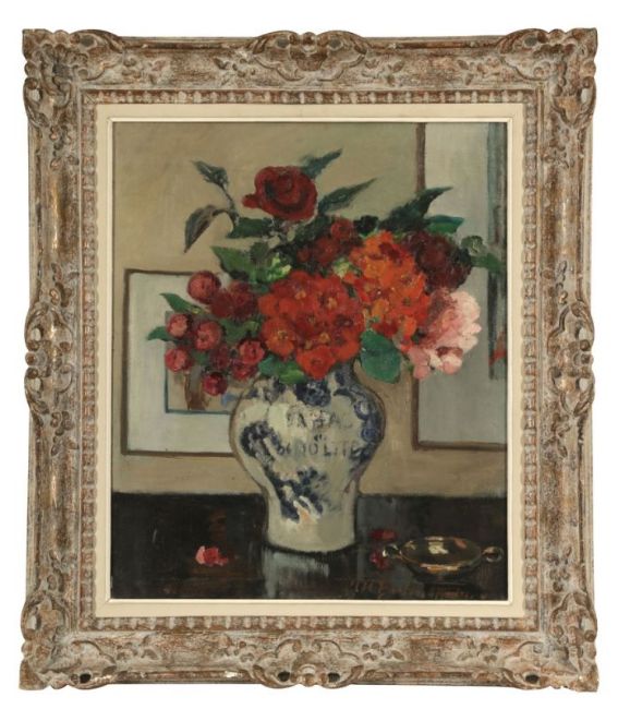 1868 Roubaix - Blumenvase - Öl/Lwd. 65 x 53,7 cm. Sign. r. u.: M Berton Maire. Verso bez. und betit. auf Spannrahmen: M Berton Maire / Le Concours Salon des artistes français / 1. médaille d'or Paris 1942 / La vase de fleurs. Rahmen. Berton erhielt für ihre künstlerische Arbeit mehrere Auszeichnungen, darunter auch die bedeutende Goldmedaille des Salon der Société des artistes français in Paris 1942, die diesem Gemälde beigegeben ist. Besonders farbenprächtiges Blumenstück in impressionistischer Malweise. Die in leuchtenden Rottönen gehaltenen Blüten des Blumentraußes sind dabei so pastos gearbeitet, dass sie fast reliefartig aus der Komposition hervortreten und der Darstellung so Tiefe verleihen.
