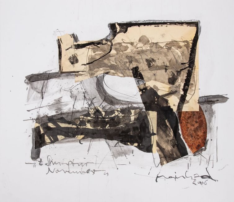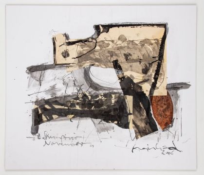 1937 Dahlbruch - 2016 Barsinghausen - Komposition II - Collage/Karton auf Karton. 69 x 80 cm. Sign. und dat. r. u.: Meinhard / 2006. Bez. l. u.: z. Skulptur / November. Das Blatt liegt lose. - Lit.: Hannes Meinhard. Stahlskulpturen. Zeichnungen. Herausgegeben von Brigitte von Schönfels. Isernhagen 1997.