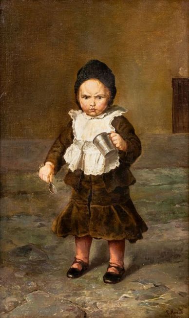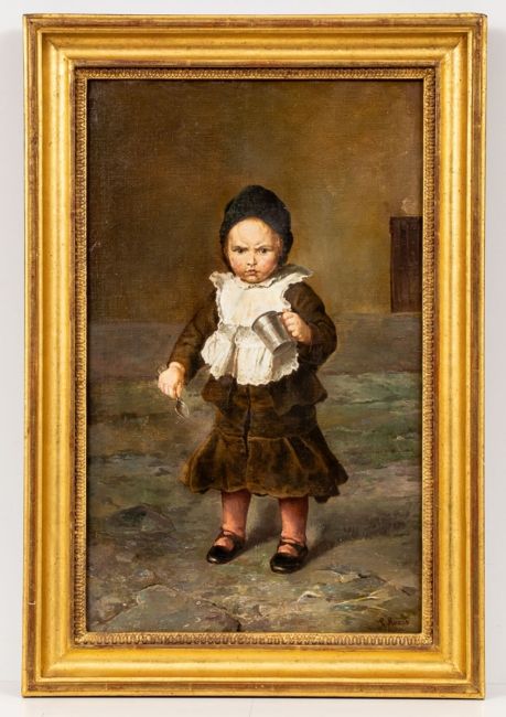 1829 Wiesbaden - 1910 Berlin - "Mein Napf ist leer" - Öl/Lwd. auf Holz. 53 x 33 cm. Sign. und dat. r. u.: L. Knaus / 1896. Rahmen. Etwas rest. Kl. Fehlstelle l. - Lit.: Th.-B. XX, S. 570/74. Schüler von C. F. Sohn an der Düsseldorfer Akademie. Mitbegründer des Malkastens.