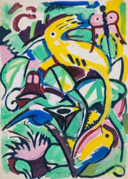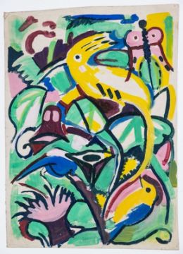 1896 Nienburg - 1983 Wietzen - Frühlingserwachen - Gouache/Papier. 44 x 31 cm. Das Blatt liegt lose. Ränder mit (wohl malbedingten) Nadeleinstichlöchern. Etwas knickspurig im Randbereich. - Lit.: Allnoch, Michael (Hrsg.). Ernst Thoms. Werkverzeichnis 1920-1983. Nienburg/Weser 2013 (nicht verzeichnet). - Die Arbeit wurde unter der Werkverzeichnisnummer Th-02836 in den Nachtrag des Werkverzeichnisses aufgenommen. Diese frühe, wohl um 1920 entstandene Arbeit (vgl. hierzu die auf das Jahr 1920 datierte Arbeit: "Urwald mit Vogel", Auktion Kastern, No. 155, 19.9.2015, Los 102) steht kompositorisch und thematisch den damals zeitgenössischen Werken Franz Marcs und Heinrich Campendonks nahe, mit denen sich der Künstler hier auseinandergesetzt haben könnte. Schüler von F. Burger-Mühlfeld und Hauptvertreter der Neuen Sachlichkeit Hannover. 1928 Ausstellung in der Galerie Neumann-Nierendorf. Beteiligung an den Deutschen Kunstausstellungen in Amsterdam und Stockholm.