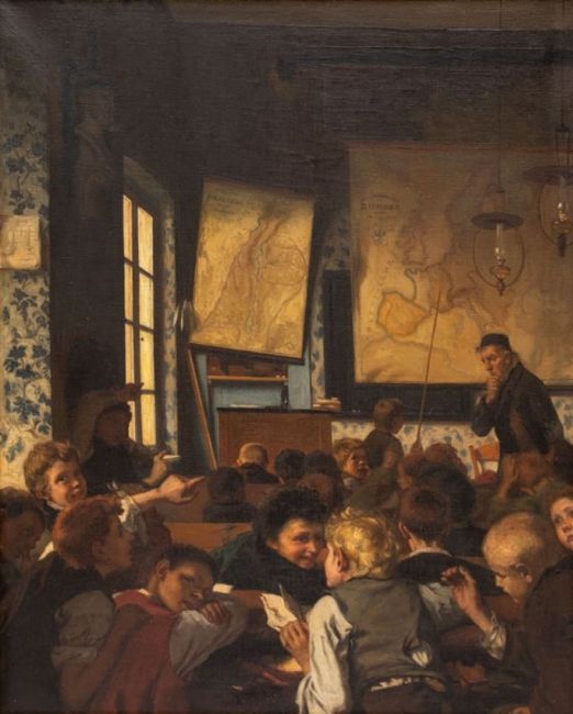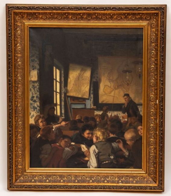 1837 Breslau - 1895 Düsseldorf attr. - "Jung-Deutschland in der Schule" (Schulstube während des Geographieunterrichts) - Öl/Lwd. 82 x 65 cm. Rahmen. Etwas angeschmutzt. Kl. Löchlein am linken Rand. - Lit.: http://www.smb-digital.de/eMuseumPlus?service=ExternalInterface&module=collection&objectId =964788&viewType=detailView Bei dem Gemälde könnte es sich um eine Replik des Originalgemäldes aus dem Jahr 1874 handeln, das sich in der Alten Nationalgalerie in Berlin befindet (Ident.Nr. A I 105). Die Existenz zweier Repliken, darunter eine im Museum der bildenden Künste Leipzig und eine weitere in privatem Besitz sind bekannt. (vgl. hierzu den oben angeführten Onlineartikel von Claude Keisch).