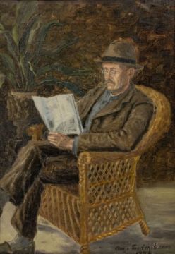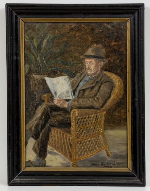 Künstler des 20. Jahrhunderts - Lesender Mann im Korbstuhl - Öl/Lwd. 53 x 38 cm. Sign. und dat. r. u.: Aage Frederiksen / 1926. Rückseitig auf Papieretikett bez. Rahmen. Kl. Delle r. u. Verso ein Flicken.