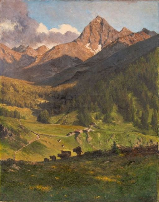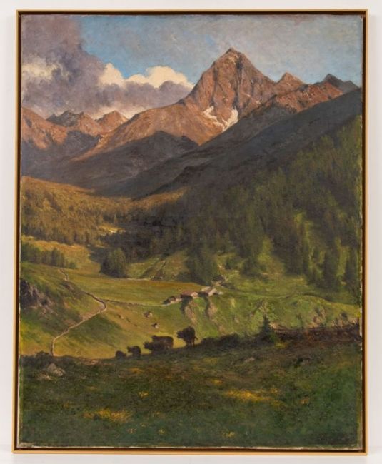 1855 Berlin - 1934 Berlin - "Alpe Mareil bei Kühtai" - Öl/Lwd. 110 x 86,5 cm. Sign. r. u.: GH Engelhardt. Rückseitig auf Keilrahmen bez. und betit. Rückseitig mit altem Papieretikett: Kunstpalast Düsseldorf / 1816. Rahmen (Schattenfuge).