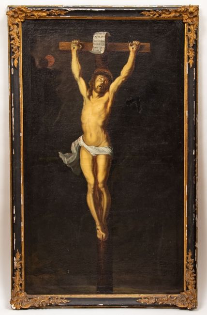 1599 Antwerpen - 1641 London Nachfolger - Christus am Kreuz - Öl/Lwd. 126 x 74 cm. Rückseitig unten etwas undeutl. bez. Rahmen. Verso ein Flicken. Krakelee.