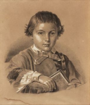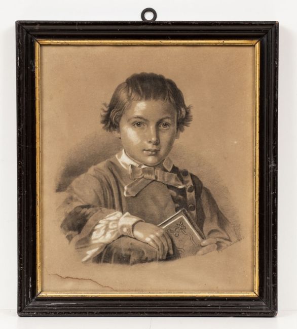 Künstlerin des 19. Jahrhunderts - Bildnis eines Kindes mit Buch - Kohle, weiß gehöht/graues Papier. 37,5 x 32 cm. Sign. und dat. r. u.: Julie Rothschild 4.12.(18)75. Unter Glas gerahmt. Wasserfleck l. u.