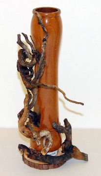 Öllingen - Zauberflöte - Material: Flötenteil, Olivenwurzel, Astscheibe, beklebt mit Satzschnipseln, Höhe ca. 38 cm. Internet: www.freya-kunst.de