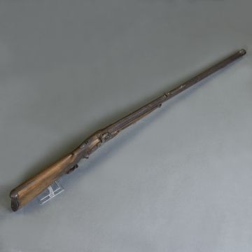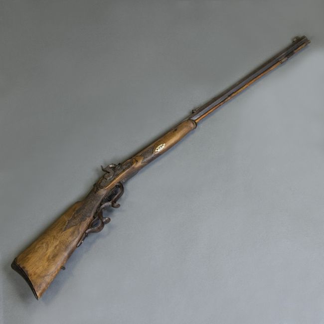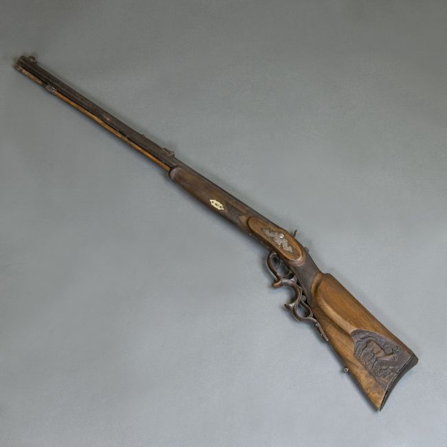 Erste Hälfte 19. Jahrhundert. Holz, Metall. L. 110 cm. Perkussionsschloss. Auf Oberseite des Laufs beschriftet: KOBLER IN SCHWABMÜNCHEN. Alters- u. Gebrauchsspuren, teils best., Holz teils rissig, Schaftkappe leicht von Schaft getrennt. Versand nur innerhalb Deutschlands. Schaft auf einer Seite mit dem Relief eines Rehes beschnitzt.