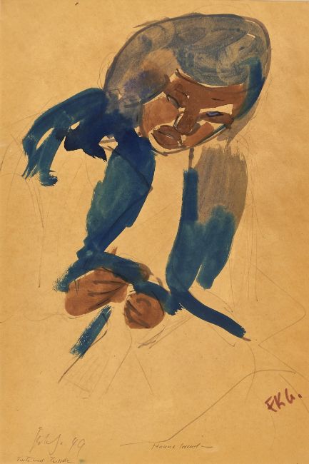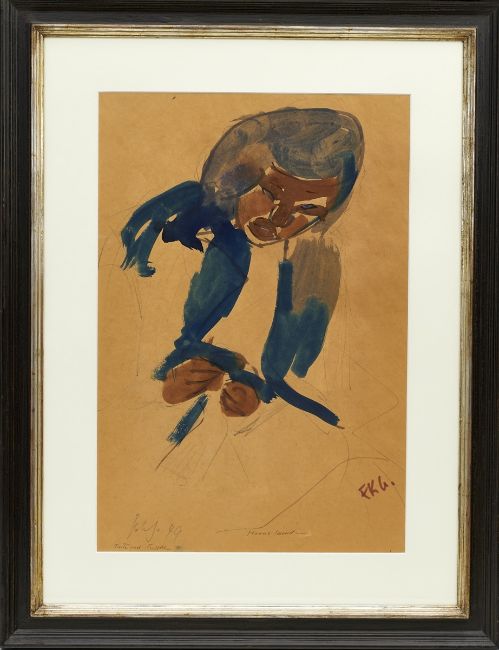 1900 Pries bei Kiel - 1984 Schleswig - "Hanne lesend" - Tinte und Tusche/bräunliches Papier. 59 x 40 cm. Sign. und dat. l. u.: Gotsch (19)49. Monogr. r. u.: FKG. Betit. M. u.: Hanne lesend. Bez. l. u.: Tinte und Tusche. Rückseitig auf Etikett der Galerie Koch, Hannover bez. und betit. Dort mit Provenienzangabe: Musée Petit Palais Genf (10367). Passepartout. Unter Glas gerahmt (Galerierahmen). F. K. Gotsch nahm 1919 Unterricht bei dem Maler und Grafiker Hans Ralfs in Kiel. Bereits 1920 erhielt er in der dortigen Kunsthalle die erste Einzelausstellung. Edvard Munch wurde schnell zu seinem Vorbild. Gotsch wechselte an die Kunstakademie in Dresden, wo er zuletzt von 1921-1923 als Meisterschüler bei Kokoschka studierte. Nach einer langen USA-Reise und Studienaufenthalten in Paris, Italien, Südfrankreich und München ließ er sich 1933 in Berlin nieder. Seine Arbeit wurde jedoch zunehmend durch die Nationalsozialisten behindert. Bomben zerstörten sein Atelier und vernichteten den größten Teil seiner Werke. Aus der Gefangenschaft zurückgekehrt, widmete er sich wieder intensiv der Malerei. Gotsch entwickelte seinen "späten Expressionismus" nach einer Phase, in der er sich mit Picassos Kubismus und Abstraktionen beschäftigt hatte. Er war in zahlreichen Ausstellungen präsent und erhielt namhafte Auszeichnungen. Ein großer Teil seiner Werke sind in die Sammlung des Petit Palais Genf und in die K. F. Gotsch-Stiftung am Schleswig-Holsteinischen Landesmuseum im Jahr 1968 gegangen.