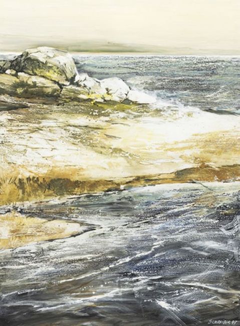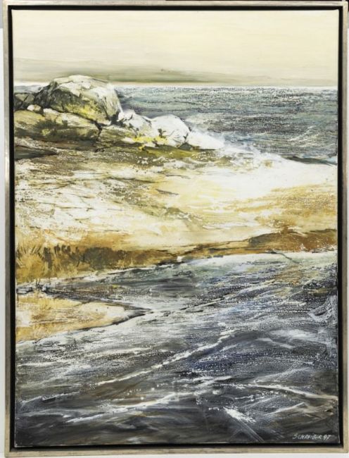 1949 Bremen - 2012 - Küstenlandschaft - Öl/Lwd. 120 x 90 cm. Sign. und dat. r. u.: SCHREIBER (20)06. Rückseitig Etikett der Galerie Jaeschke, Braunschweig. Rahmen (Schattenfuge).