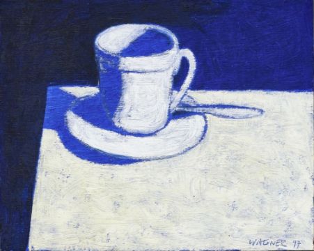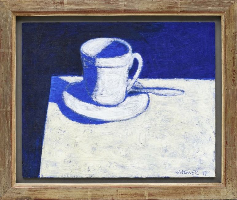 1942 Hildesheim - "Der Kaffee war gut" - Öl/Leinwandmalkarton. 24 x 30,2 cm. Sign. und dat. r. u.: WAGNER (19)97. Rückseitig auf Etikett der Galerie Koch, Hannover bez., betit., dat. und num.: (...) Werk-Nr. K/ Wa 182. Rahmen (Schattenfuge).