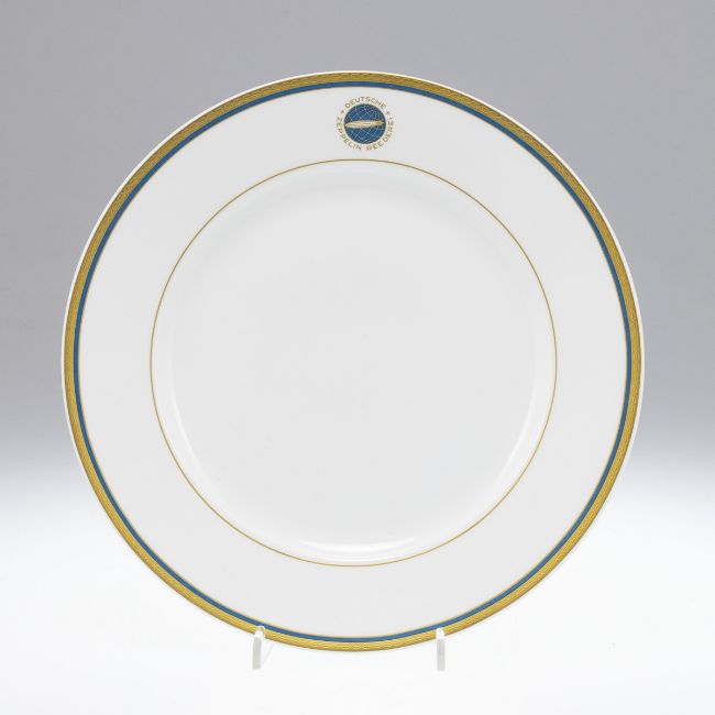 Heinrich und Villeroy & Boch, Mettlach 1985. Bone China, elfenbeinfarbig glasiert. Blauer Rand. Radierter Goldrand. Auf der Tellerfahne: Weltkugel mit Zeppelin-Luftschiff und DEUTSCHE ZEPPELIN REEDEREI. Auf der Glasur violette Herstellermarke: Krone HEINRICH c Villeroy & Boch BONE CHINA LIMITIERTE AUFLAGE DES ORIGINALTELLERS 1500 Stück. 1. Wahl. H. 3 cm, D. 25 cm. Aufgeklebte Wandhalterung. Zertifikat: "Anläßlich der Eröffnung des Kultur- und Tagungszentrums "Graf-Zeppelin-Haus" in Friedrichshafen am Bodensee am 17. Oktober 1985 ... originalgetreu nachgefertigt. Die Auflage ist auf 1500 Exemplare limitiert." 1935 wurde die Deutsche Zeppelin-Reederei (DZR) gegründet. Ab diesem Zeitpunkt wurde das Emblem LZ (Luftschiffbau Zeppelin), welches bisher auf dem Geschirr war, durch jenes der DZR (Deutsche Zeppelin-Reederei) abgelöst. Das Design war ähnlich dem vorherigen schlicht gehalten. Tassen- und Tellerrand zierte ein Goldrand und die Weltkugel mit Zeppelin-Luftschiff war am Rand abgebildet. (https://digitalesammlung.zeppelin-museum.de/details.php?item=126)
