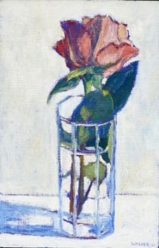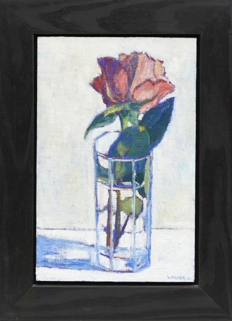 1942 Hildesheim - "Rose vor hellem Hintergrund" - Öl/Lwd. auf Holz. 40 x 26 cm. Sign. und dat. r. u.: WAGNER (20)02. Rückseitig auf Etikett der Galerie Koch, Hannover bez. und betit. Dort auch mit Provenienzangabe: Atelier des Künstlers. Rahmen (Schattenfuge). Von 1961 bis 1964 hat der Künstler an den Kunstakademien in Berlin bei Prof. Hermann Kasper und München bei Prof. Heinz Trökes studiert. Sein Werk umfasst Ölgemälde, Aquarelle und Holzschnitte. Im Alpenvorland und auf Korsika findet er Anregungen für seine Landschaften und Stillleben. Mehrfach wurden seine Arbeiten schon in Einzelausstellungen gewürdigt, u. a. auch in Hannover.