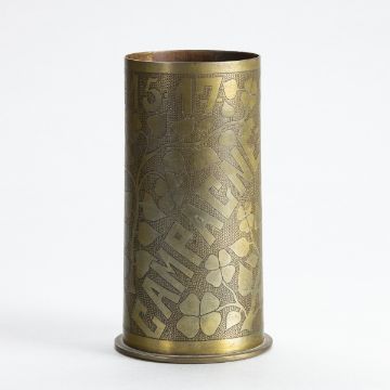 Deutschland/Frankreich, Anfang 20. Jahrhundert. Messing, graviert/geätzt. H. 16,6 cm. D. 9 cm. Auf Boden bez.: RhMF 1912 / L 4 / DÜSSELDORF. Auf Wandung bez.: CAMPAGNE D`ORIENT - 1915-17. Salonique Mosquée Originale. Altersspuren. Auf der Wandung Darstellung der Basilika / Moschee von Thessaloniki zwischen Zweigen.