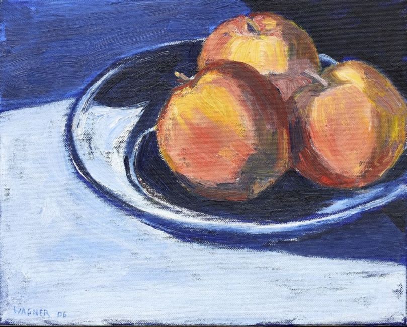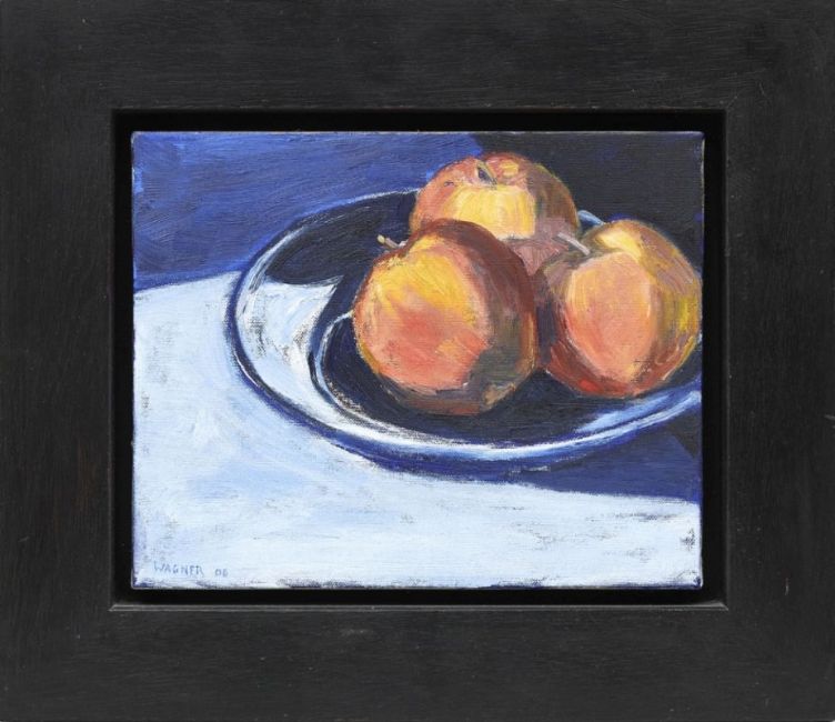 1942 Hildesheim - "Apfelstilleben im Morgenlicht" - Öl/Lwd. 24 x 30 cm. Sign. und dat. l. u.: WAGNER (20)06. Rückseitig auf Etikett der Galerie Koch, Hannover bez. und betit. Rahmen (Schattenfuge). Von 1961 bis 1964 hat der Künstler an den Kunstakademien in Berlin bei Prof. Hermann Kasper und München bei Prof. Heinz Trökes studiert. Sein Werk umfasst Ölgemälde, Aquarelle und Holzschnitte. Im Alpenvorland und auf Korsika findet er Anregungen für seine Landschaften und Stillleben. Mehrfach wurden seine Arbeiten schon in Einzelausstellungen gewürdigt, u. a. auch in Hannover.