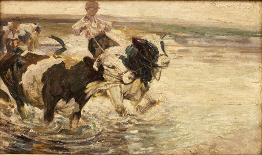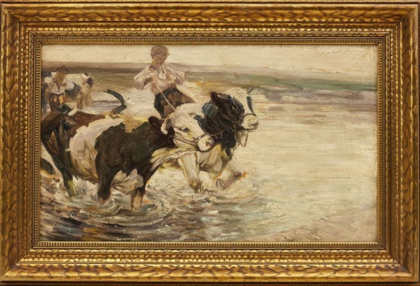 1850 Murrhardt - 1941 München attr. - Durchs Wasser - Öl/Karton. 35,5 x 59,5 cm. Rahmen. - Lit.: vgl. Diem 484 sowie 485. Bei dem Gemälde dürfte es sich um eine Studie, u. a. zu dem großformatigen Gemälde "Durchs Wasser" (vgl. Diem 485, von-der-Heydt-Museum, Wuppertal, Inv.-Nr. G 0503) handeln.