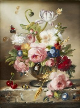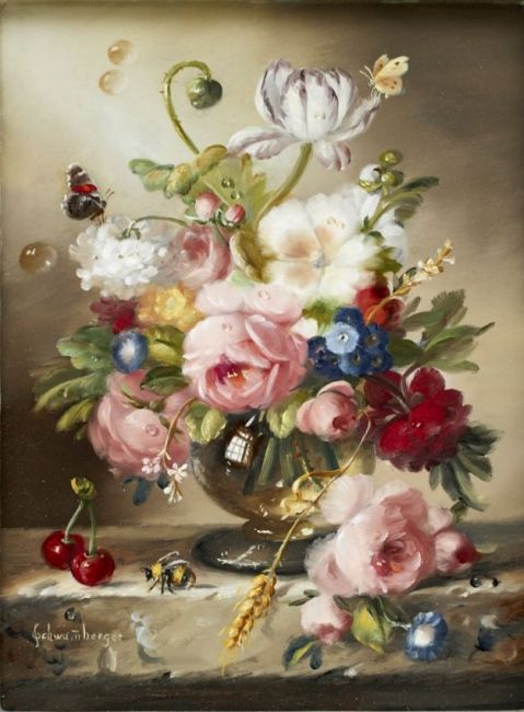 1950 Essen - lebt und arbeitet in Plattling - Altmeisterstrauß mit Schmetterling und Hummel - Öl/Holz. 20 x 15 cm. Sign. l. u.: Schwam(m)berger. Rahmen. Hildegard Schwammberger war Meisterschülerin von Stieglitz in Essen. Sie erhielt 1972 den Folkwang-Preis. Neben Hubert Kaplan ist sie zurzeit die bekannteste "Miniaturmalerin" in Deutschland.