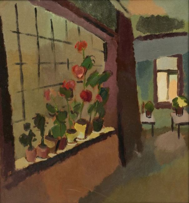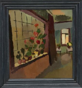 Hans Zank (1889 Berlin - 1967 Falkensee) Willi Gericke (1895 Havelstadt - 1970 Falkensee) - "Blumen auf der Fensterbank - Interieur" - Öl/Karton auf Lwd. 53 x 49 cm. Rückseitig mit dem Nachlassstempel sowie der Werkverzeichnisnummer. Rahmen. Zwei leichte Kratzspuren unten. - Lit.: Hans Zank und Willy Gericke. Zwei bedeutsame Berliner Maler in einer bewegten Zeit der Welt- und Kunstgeschichte. Verden 1987, Nr. 322. Willi Gericke und Hans Zank orientierten sich vor allem in den 1920er Jahren an expressionistischen Künstlern wie Max Beckmann oder Emil Nolde. Zank studierte 1912 an der Leipziger Akademie. Die enge Freundschaft mit Willy Gericke, der später bei Johannes Walter-Kurau studierte, begann schon zu Schulzeiten. Im Laufe der Jahre entwickelten Zank und Gericke eine regelrechte Symbiose. Bis auf wenige Ausnahmen ist kein Bild von einem der beiden signiert. Dann ist es selbst für Kenner unmöglich, es exakt einem zuzuordnen. Viele Bilder haben sie tatsächlich auch gemeinsam gemalt.