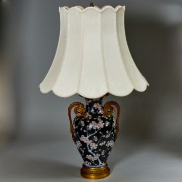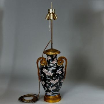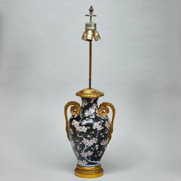 China / Deutschland, 19. Jahrhundert. Porzellan, unterglasurblau und unterglasurrötlich / -bräunlich bemalt; schwärzlicher Fond; Reliefdekor; Bronzemontierungen mit leichter- / Restvergoldung. H. ohne Lampengestänge 51 cm. Unterseite Mitte Lampenbohrung u. Reste eines Exportsiegels (roter Lack). Standring zwei produktionsbedingte Kerben. Auf bronzenem Standring Herstellergravur: C. H. Preetz Berlin. Altersspuren, partiell leicht angeschmutzt, die Handhaben etw. locker, Montierungen teils ber. / angelaufen, bronzener Standring minimalste Delle. Funktion ohne Gewähr. Exportvase mit Famille noir Prunus-Dekor. Die Zweige und Blüten sind reliefartig gestaltet. An der Vasenmündung und am Vasensockel unterglasurblaues Zahnschnittfries-Dekor, flankiert von unterglasurblauen Linien.
