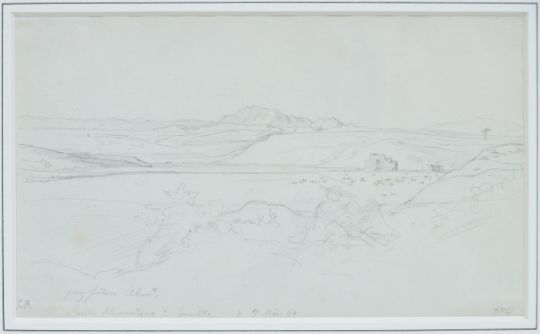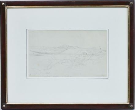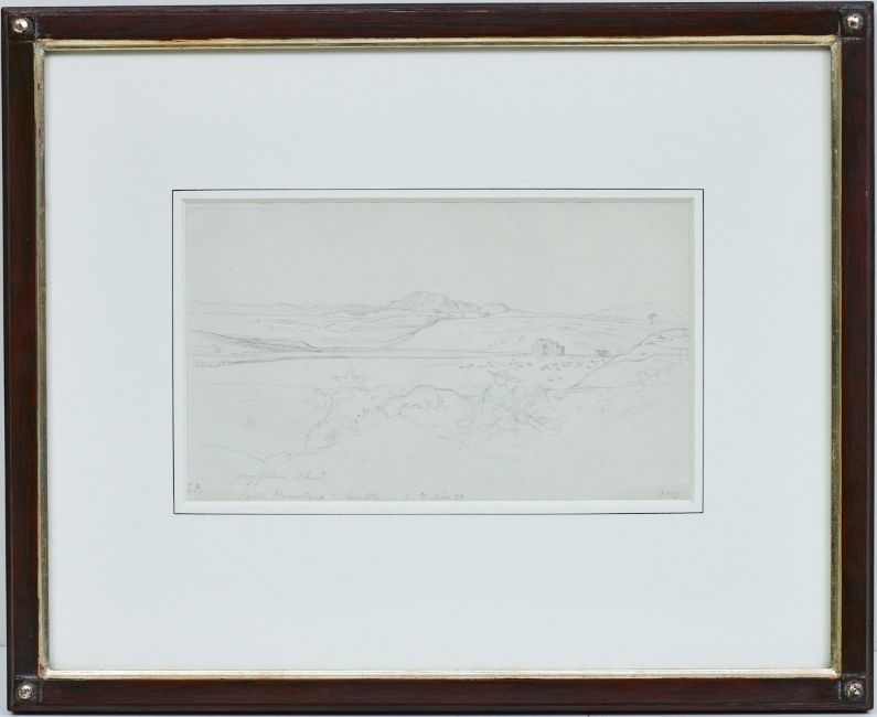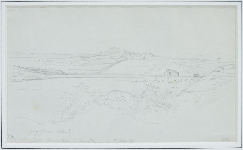 1803 Dresden - 1884 Dresden - "Ponte Nomentano su Soratte" - Bleistift/Papier. 19 x 11,4 cm (Passepartoutausschnitt). Bez. M. u.: ganz heiterer Abend / Ponte Nomentana su Sora(t)te 7 / März 24. Monogr. l. u.: L R. Rückseitig bez., sign. und dat. r.: Zeichnung von Ludwig Richter 1824 / Marie Luise Julia Richter, geb. (...), 1891 / Joh. Friedrich Hoff. Passepartout. Unter Glas gerahmt. Blick auf das bukolisch friedliche Tibertal Latiums mit der Brücke Nomentano und dem Monte Soratte im Hintergrund.