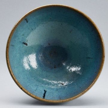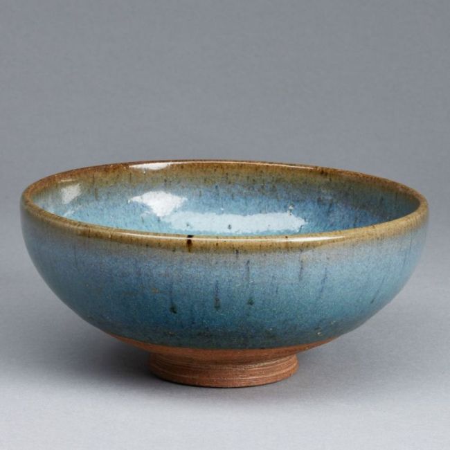 Japan / China, 19. Jahrhundert. Keramik, dunkelbraun. Blau-braun Glasur. H. 7,5 cm. D. 17,5 cm. Glasur mit leichtem Krakelee. Rissspuren in der Glasur. Im Inneren der Schale kleiner Chip. Alterspuren.