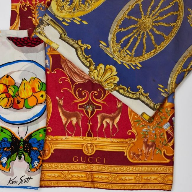 Gucci, Ken Scott, Hermès. Fa. Gucci, Italien. Seide. 87 x 87 cm. Zustand: Gebrauchsspuren. Fa. Ken Scott, USA/Paris. 87 x 81 cm. Zustand: Tragespuren sichtbar. Fa. Hermès, Paris. 86 x 91 cm. Zustand: Sichtbare Gebrauchsspuren an den Ecken, verändert! Kleine Flecken, verblassende Farbe, handgerollte Kanten. Material: 100% Seide. Verschiedene Dekore: Diana (Gucci). Blumendruck (Ken Scott). Blaue Seide mit goldenen Rädern (Hermès).