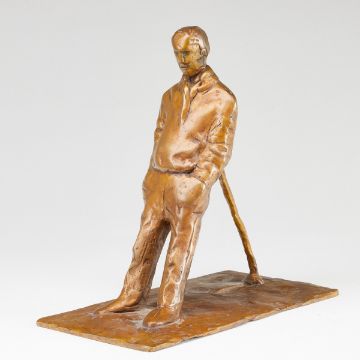 1931 Dormagen - lebt und arbeitet in Hannover -"Gestützter Mann"- Bronze. Goldbraun patiniert. 3/5. 24 x 24,5 x 12,5 cm. Auf der Plinthe monogr.: nh. Auf der Unterseite Gießervermerk: GUSS WITTKAMP ELMENHORST.