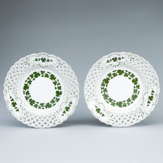 Staatliche Porzellan Manufaktur, Meissen 1972-1980. Porzellan, weiß, glasiert. Unter der Glasur grün bemalt. Unter der Glasur blaue Schwertermarke. Zwei Schleifstriche. H. 4 cm, D. 24,5 cm.