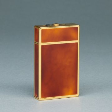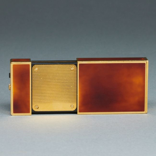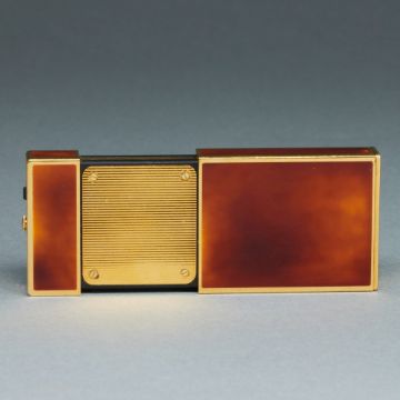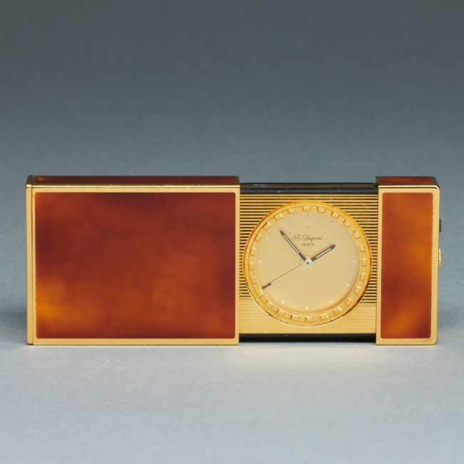 Fa. S.T. Dupont, Paris. Metall (vergoldet), orange-brauner Chinalack. Goldenes Zifferblatt. Auf dem Zifferblatt sowie auf der kurzen Seite bez.: S.T. Dupont Paris. Made in France, Laque de Chine. Nr.: 63CAH05. Maße 6 x 3,5 x 1 cm. Ausgezogener Zustand L. 9,3 cm. Funktionsfähig. Im Zusammenhang zur Serie "Reisen" produzierte S.T. Dupont einen Reisewecker im Feuerzeug-Format. Weckfunktion und Uhr.