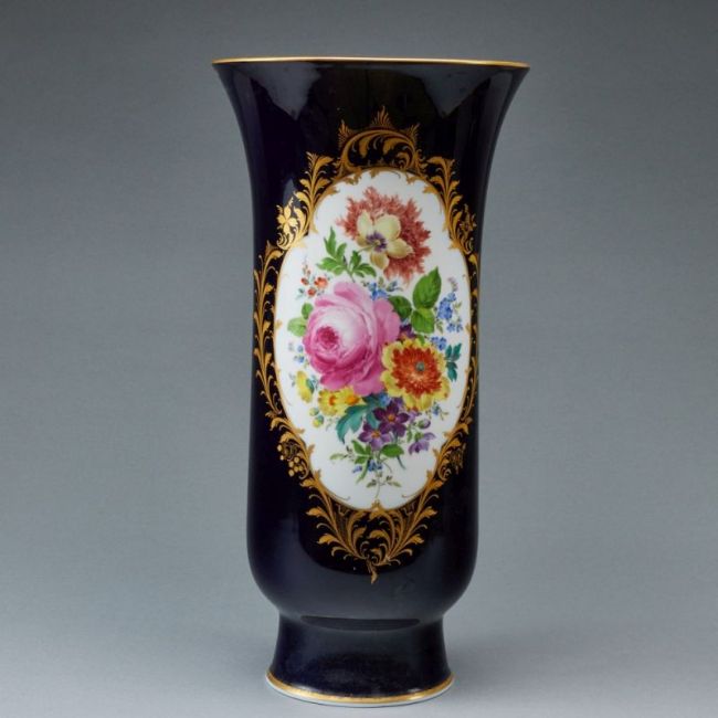 Staatliche Porzellan Manufaktur, Meissen 1980. Porzellan, weiß, glasiert. Kobaltblauer Fond. Polychrom und Gold bemalt. Goldrand. Unter der Glasur blaue Schwertermarke. Vier Schleifstriche. Dekornr. 101470. H. 42,5 cm. - Zustand: Glasur im Bereich des Fußes rau - restauriert ?.