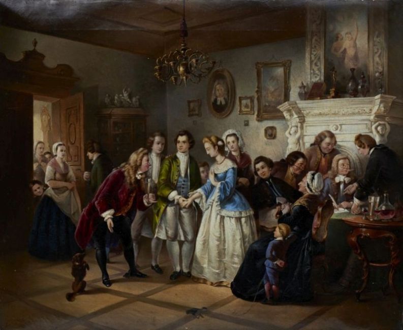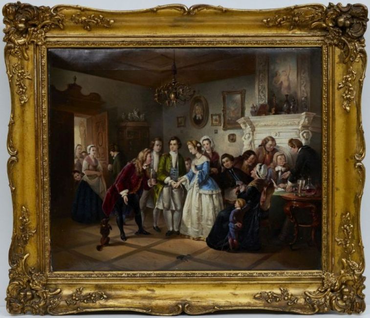 - Die Verlobung - Öl/Lwd. 49,5 x 60 cm. Holzzierrahmen. Dargestellt ist eine Verlobungsszene in gehobenem bürgerlichen Milieu. Das junge Paar, als die Hauptprotagonisten der Szene, sticht dank der Farbwahl der Oberbekleidung, grün beim Bräutigam, himmelblau bei der Braut, hervor. Unterschiedliches Publikum betrachtet die Szene. Auf der linken Seite drängt die Dienerschaft neugierig in den Raum, während auf der rechten Seite noch die rechtlichen Angelegenheiten der bevorstehenden Vereinigung verhandelt werden.