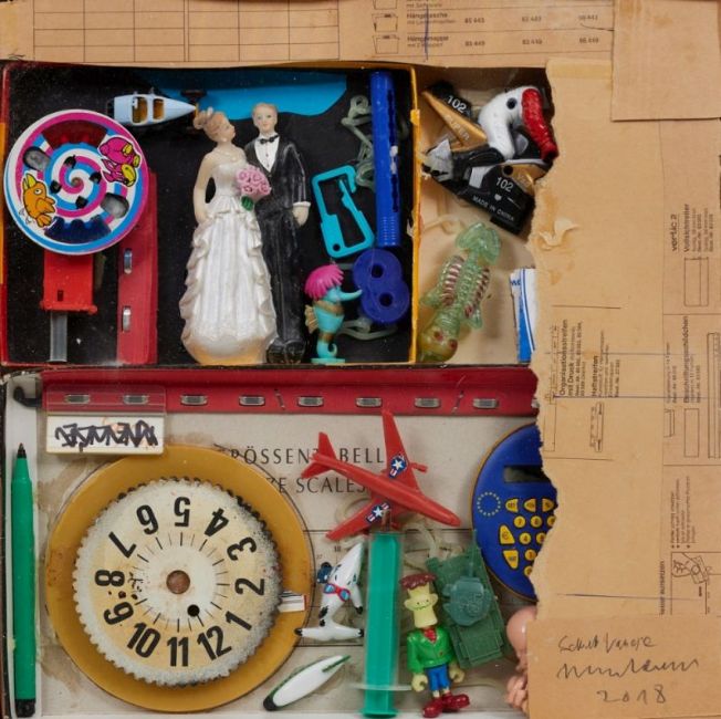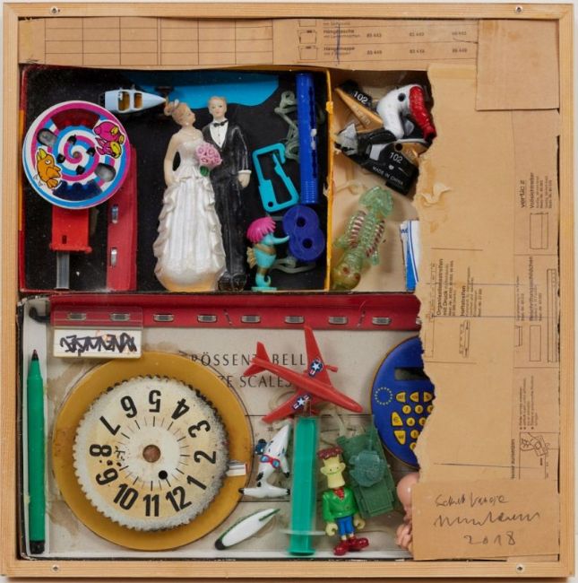 Siegfried Neuenhausen (1931 Dormagen - lebt und arbeitet in Hannover) Gerd Schmidt Vanhove (1950 - 2020) - "Kurzgeschichte 3" - Assemblage. 37 x 37 x 3,5 cm. Sign. und dat. r. u.: Schmidt Vanhove / Neuenhausen / 2018. Im Objektrahmen unter Plexiglas gerahmt.