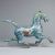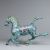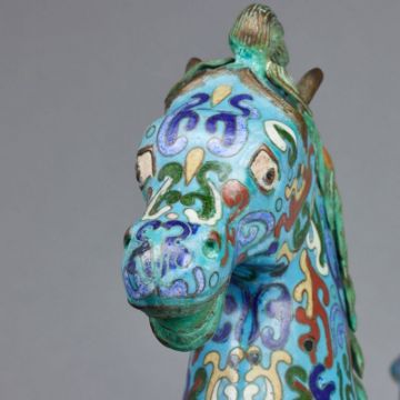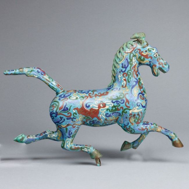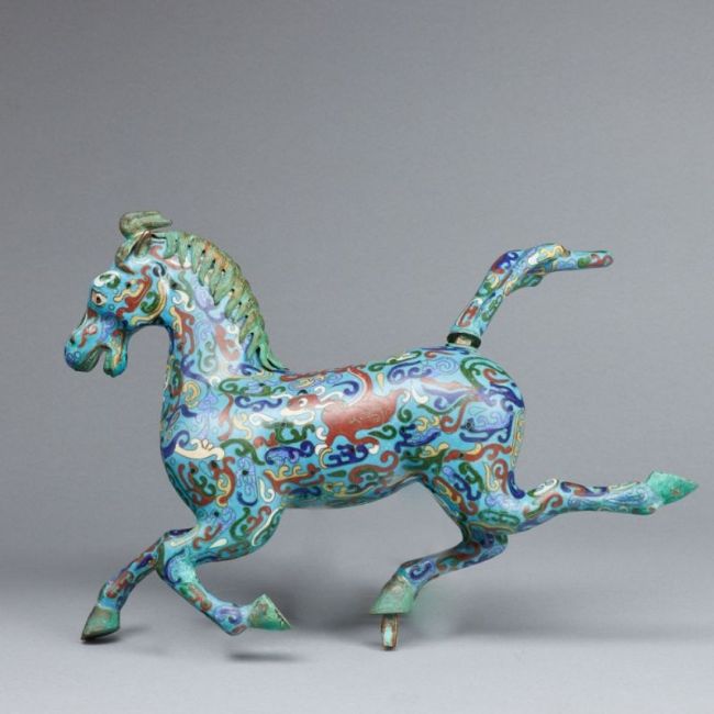 China. 20. Jahrhundert. Bronze. Polychrom bemalt. H. 30 cm. B. 42. T. 10 cm. Pferdeschwanz leicht locker. Pferdehuf ist beschädigt.