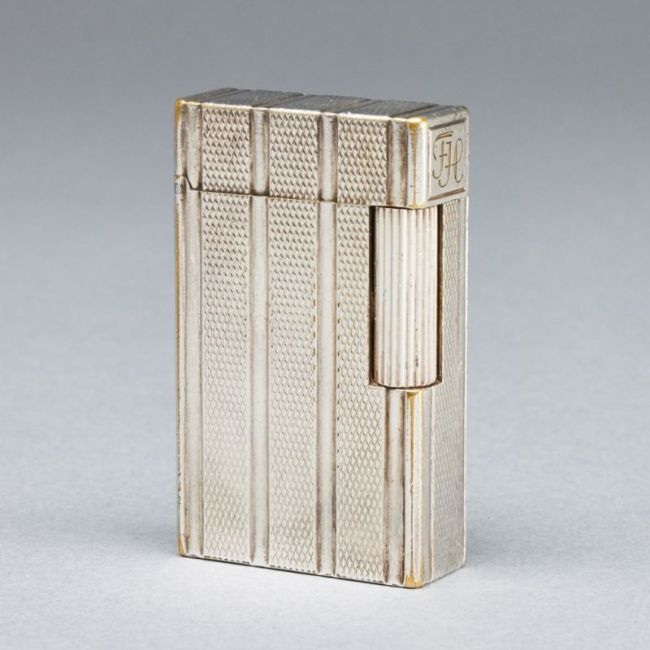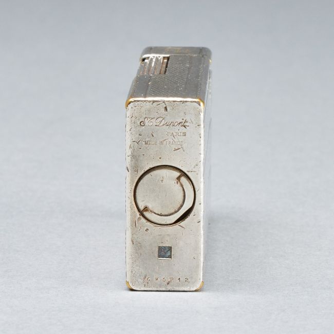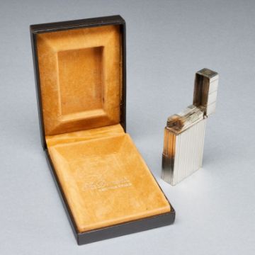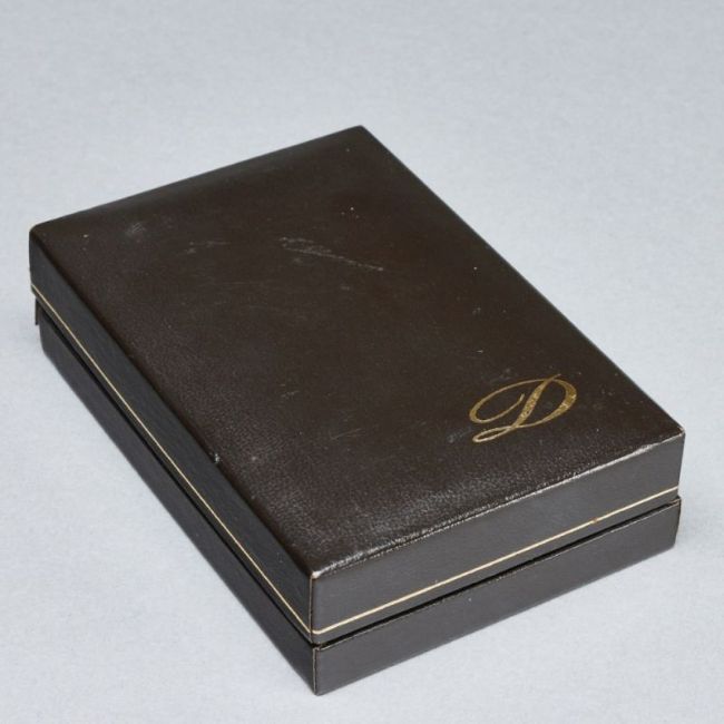Paris, 20. Jahrhundert. Metall, Etui. 5,8 x 3,5 x 1,4 cm (Feuerzeug). Monogr.: FH. Auf Unterseite bez.: S. T. Dupont / Paris / Made in France / 16KGR12. Funktion ohne Gewähr. Mit Garantiekarte. Alters- u. Gebrauchsspuren, Etui leicht desolat.